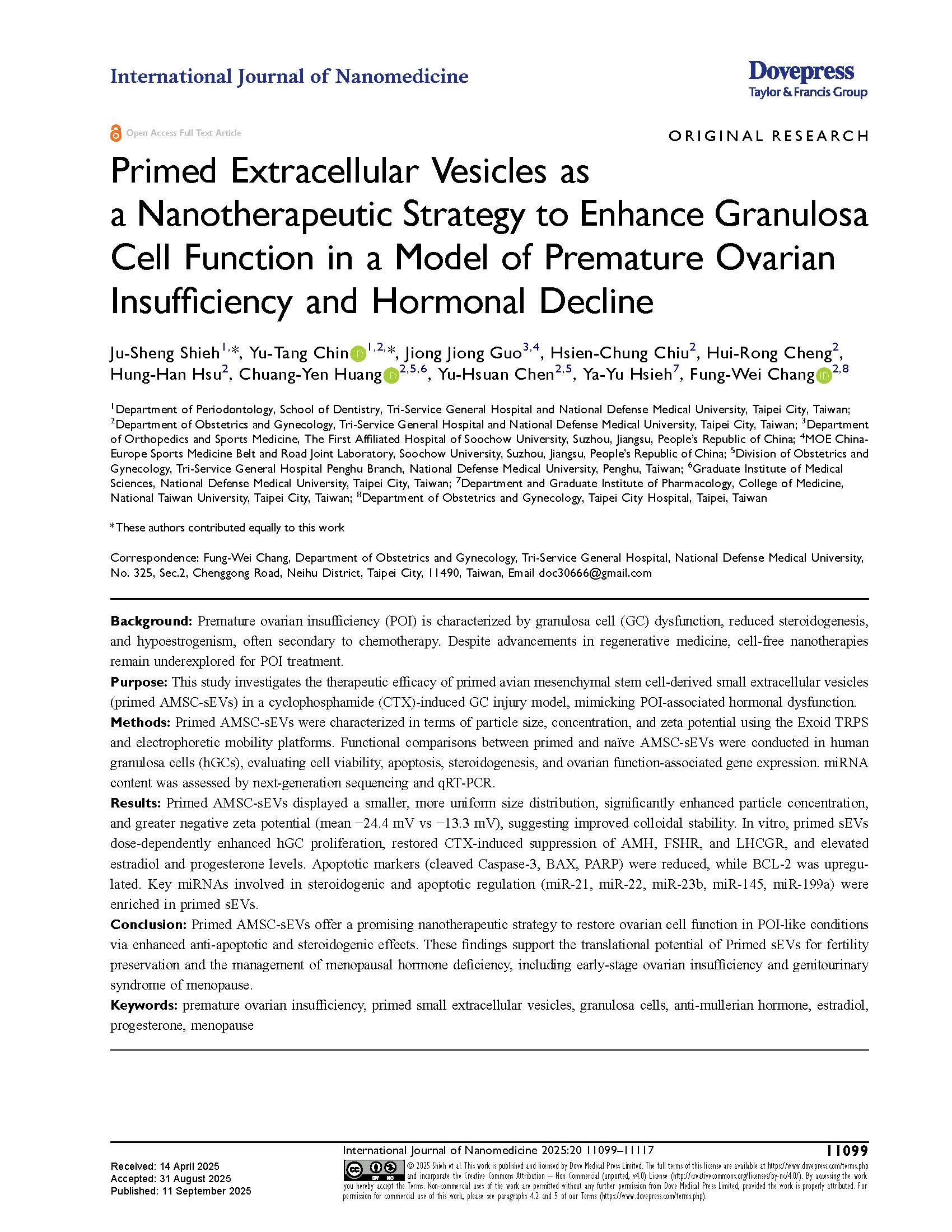 陞醫生技發表之研究論文〈Primed Extracellular Vesicles as a Nanotherapeutic Strategy to Enhance Granulosa Cell Function in a Model of Premature Ovarian Insufficiency and Hormonal Decline〉(生化脈衝外泌體在卵巢早衰證實有效)已正式刊登於國際期刊 International Journal of Nanomedicine(影響因子 IF: 6.5 )。
